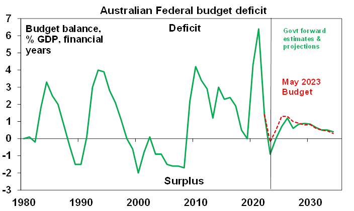 - On track for another budget surplus. The Government’s mid year review confirmed a further improvement in budget projections with the deficit for this year now projected to be just $1bn down from $14bn back in May thanks to stronger personal and company tax collections. Monthly budget data suggests that this could turn into another surplus. Its good to see the Government largely saving its revenue windfall as it will help take pressure off inflation by taking money out of the economy, but spending is still projected to grew rapidly and this partly works in the opposite direction. Meanwhile the rapid growth in tax revenue highlights the ongoing issue of bracket creep and hence the case for the Stage 3 tax cuts, although ideally the tax brackets should be indexed to wages growth.