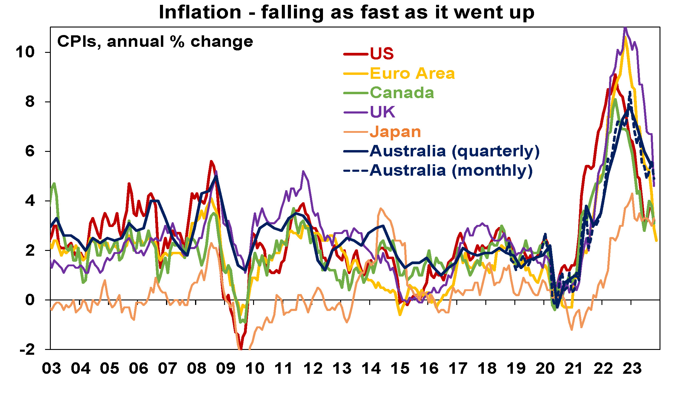 2. Disinflation. Inflation across major countries has fallen sharply from peaks of 8 to 11% last year to around 2 to 5%. Australia lagged on the way up and is doing the same on the way down, but it’s falling too.