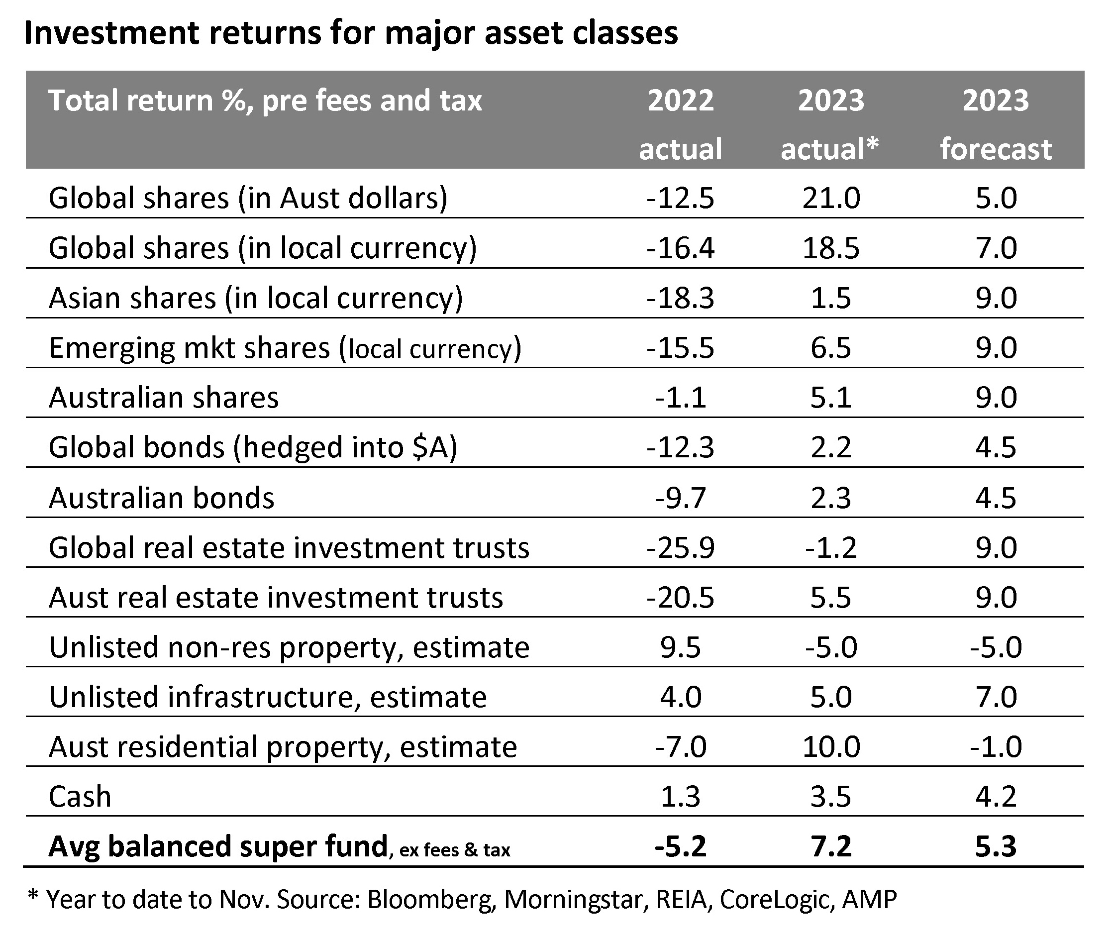 Key points- The five key themes for 2023 were: better than feared growth; disinflation; peak interest rates (probably in Australia too); lots of geopolitical threats but not as bad as feared; and AI hit the big time. This boosted shares and helped bonds with solid superannuation fund returns.