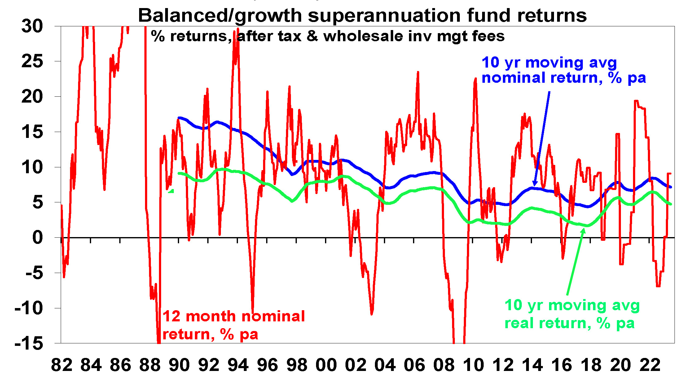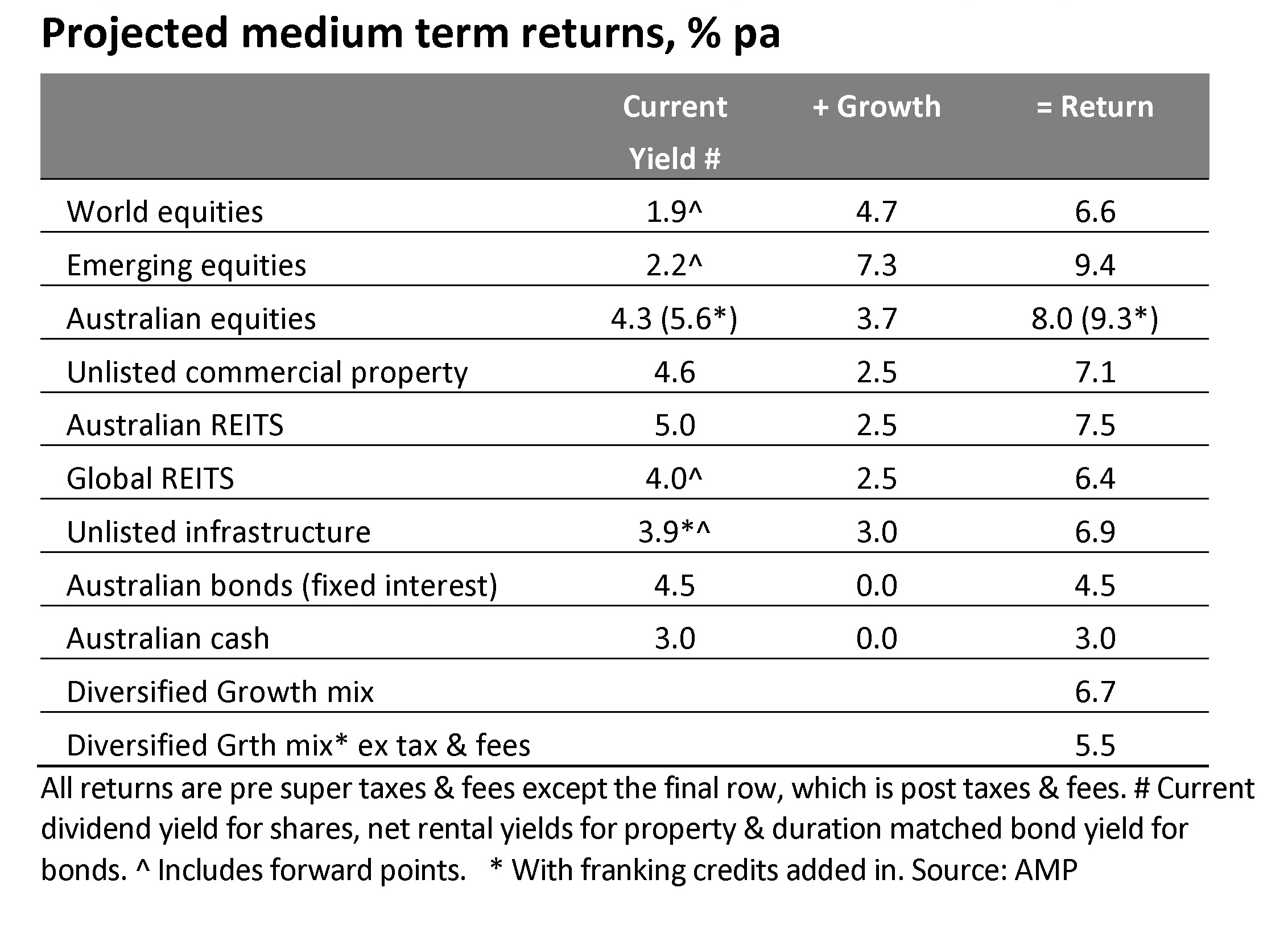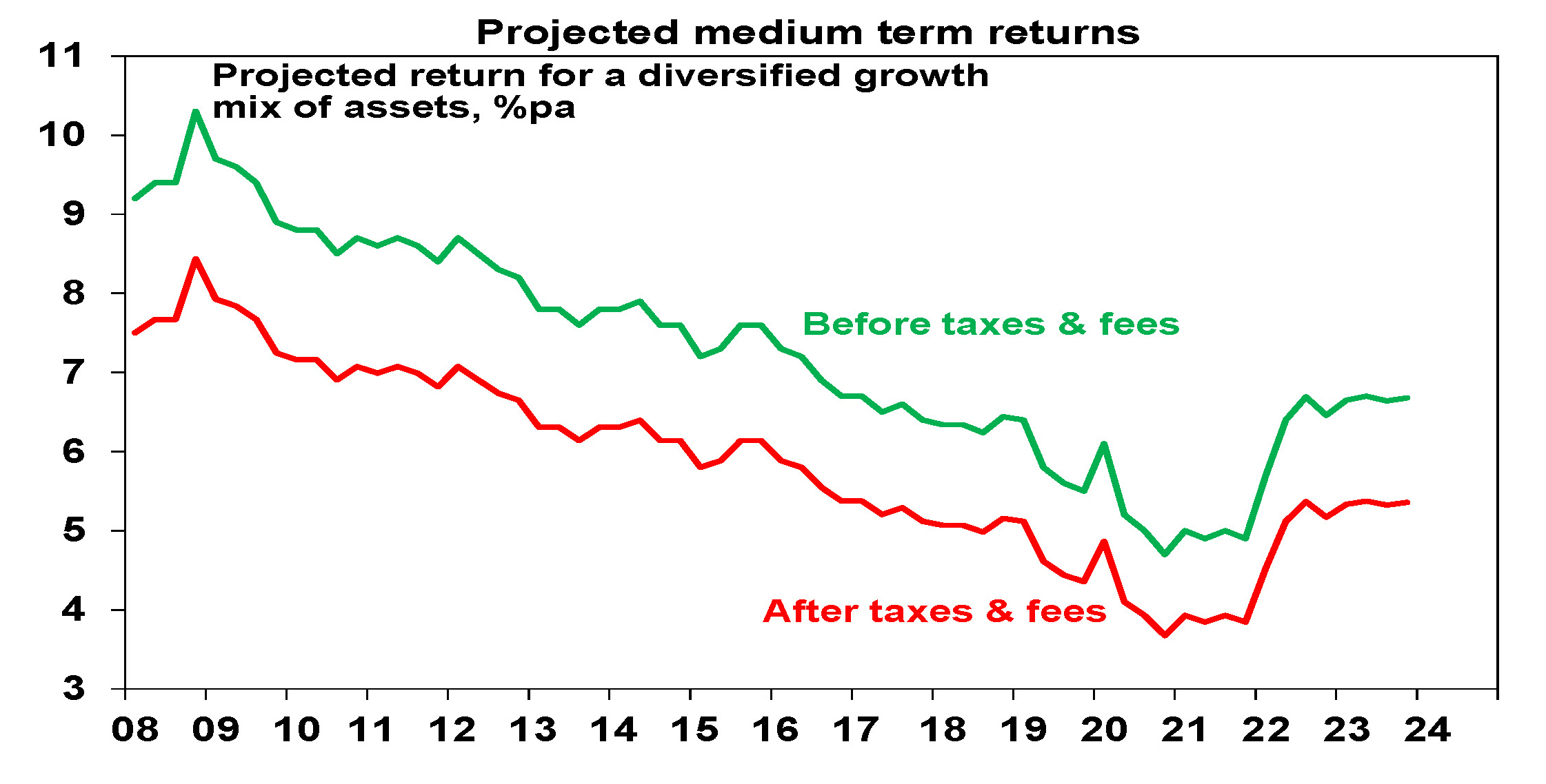 After allowing for taxes and fees this still implies pretty constrained nominal medium term returns for balanced growth super funds based on a traditional mix of assets of 5.5% pa which is a bit below the average since 2000. This is still better than bank term deposit rates which average up to 4.5% before taxes, and makes no allowance for any value added from active investment management.