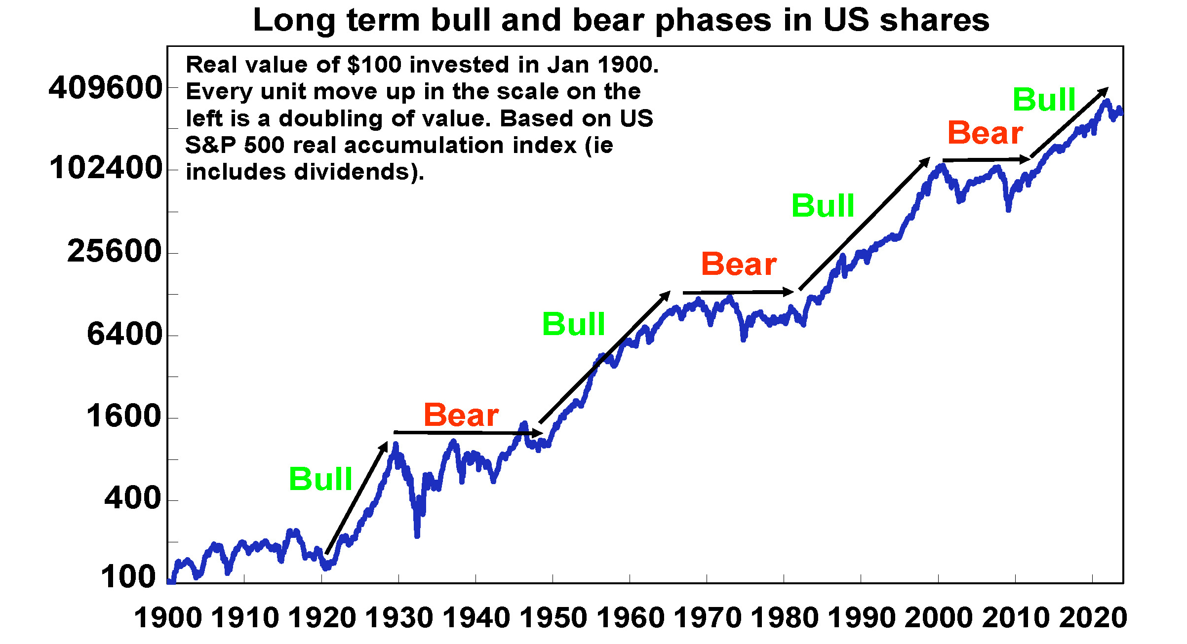 Since 1900 there have been four major secular bull markets in US shares: the 1920s (with electricity; chemicals & mass production); the 1950s and 60s (with petro chemicals, electronics & aviation); the 1980s and 90s (see the text); and since 2013. Source: Bloomberg, R Shiller, AMP