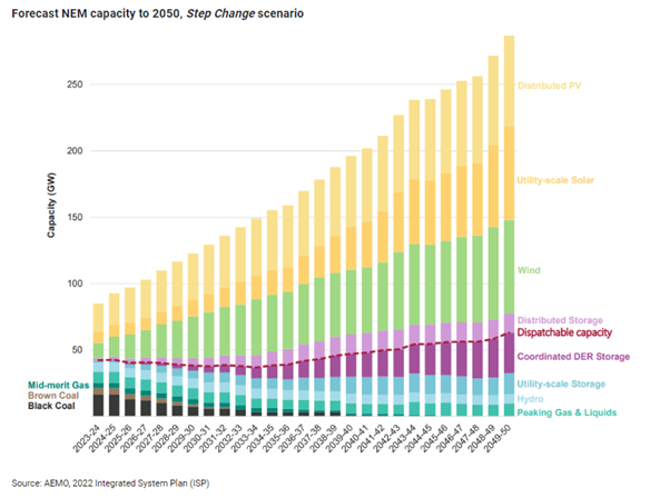Security of supplyAs fossil fuel generation decreases in importance, and intermittent renewable generation starts to dominate, investment in low-emission firming and dispatchable capacity is also required. Currently, the National Energy Market (NEM) relies on 23 GW of dispatchable firm capacity from coal-fired generation, 11 GW from gas fired and liquid-fuelled generation, 7 GW from hydro generation, and 1.5 GW from other dispatchable energy storage. AEMO’s optimal development path calls for the NEM’s firming capacity to increase to 63 GW by 2050, including the replacement of coal-fired generation. This translates into approximately 43 GW of new firming capacity.