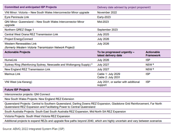 The ISP’s actionable transmission investment consists of five key transmission projects in NSW, Victoria and Tasmania. Collectively, these projects will cost around A$14 billion, however, are forecast to deliver net market benefits of A$28 billion (returning in excess of two times their cost), enable energy transition by unlocking over 20 GW of new renewable generation capacity, and manage key risks identified above. The five projects (1) HumeLink, (2) VNI West, (3) Marinus Link, (4) Sydney Ring and (5) New England REZ Transmission Link, are all currently being assessed for regulatory approval, or should begin that process soon.