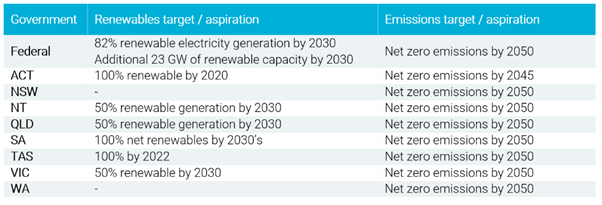 Government funding and supportMechanisms to support investment include lower-cost/concessional funding sources, leveraging government credit ratings, and/or potential community buy-in. In addition to the stat- based renewable/emissions targets, recent initiatives and developments across the market include: