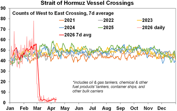 For now, the Strait remains the key, because the last ships that made it through at the end of February are now reaching their destinations meaning refineries in Asia will soon start to run low on oil to refine. So the resultant 10-15% hit to global oil supply (after allowing for diversions, eg, via the Saudi East-West tunnel) will start to bite this month. All of which risks a renewed surge in oil prices – to maybe around $US150/barrel in order to curtail consumption – and plunging share markets.