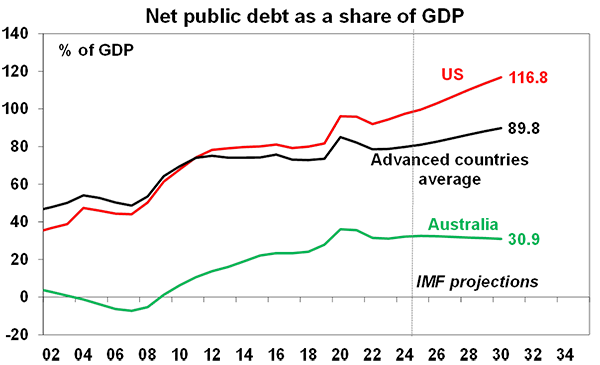 9. Bigger government and more public debt – more defence spending and government involvement in economies, eg in onshoring, mean more public spending, bigger budget deficits and ever higher public debt – at a time when its already high. The latter is particularly evident in the US with Trump pushing for a $500bn (or 42%) defence budget boost when the US budget deficit is running around 6.5% of GDP despite low unemployment suggesting it should be in surplus.