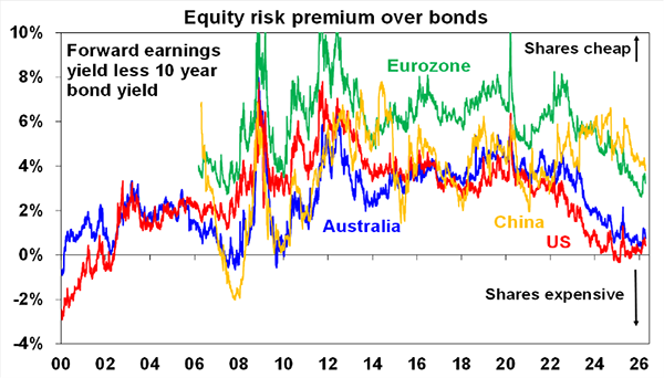 Finally, all of which runs the risk of more constrained and volatile investment returns. Which should mean that shares should be offering a higher risk premium over bonds. But at present the risk premium offered by US and Australian shares – as measured by the forward earnings yield less 10-year bond yields – remains very low despite the fall in share prices since the War started.