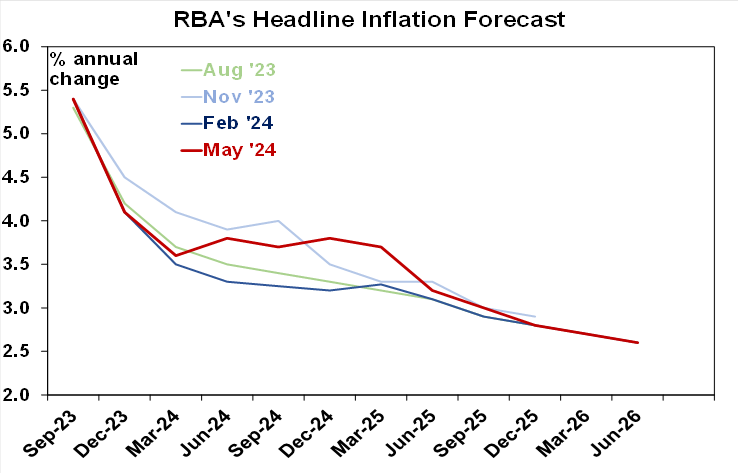 We continue to see the RBA leaving rates on hold ahead of rate cuts starting late this year. While near term risks are on the upside with the money market pricing in a 13% chance of a hike in August, we expect that inflation will slow again in the June quarter as weak demand continues to weigh. Our Pipeline Inflation Indicator is still pointing down, the Melbourne Institute’s Inflation Gauge for April points to a renewed fall in inflation and contrary to RBA assumptions energy rebates are expected to be extended in the Budget avoiding a rise in household energy prices. We are allowing for a 0.25% cut in the cash rate to 4.1% in November or December.