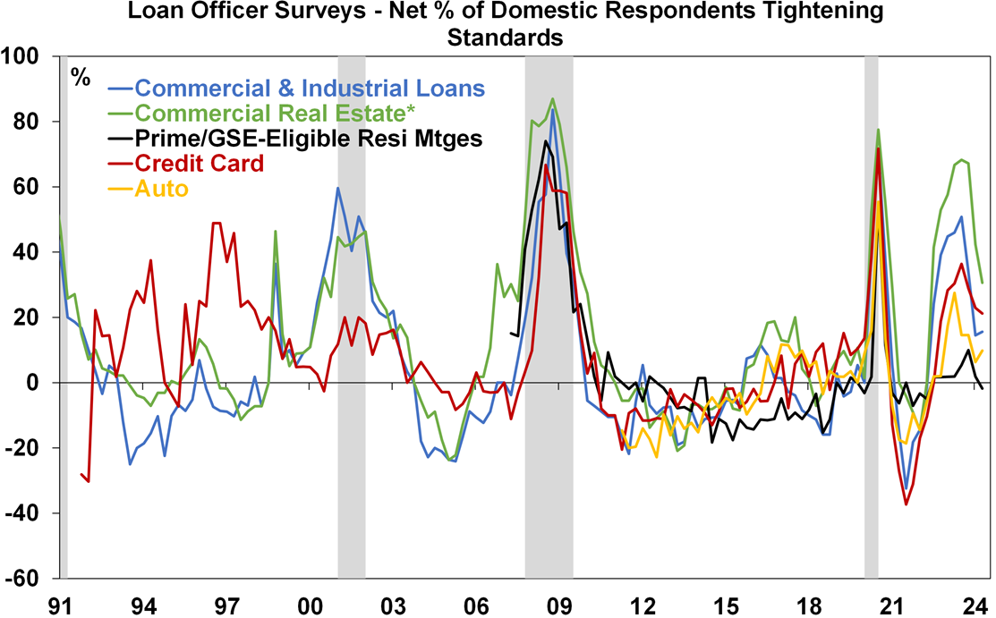 Major global economic events and implicationsIt was a relatively quiet week for US data releases. However, the latest Fed survey of bank loan officers showed a further tightening in lending standards (except for prime mortgages), but at a slowing rate. Meanwhile unemployment claims rose but remain low.
