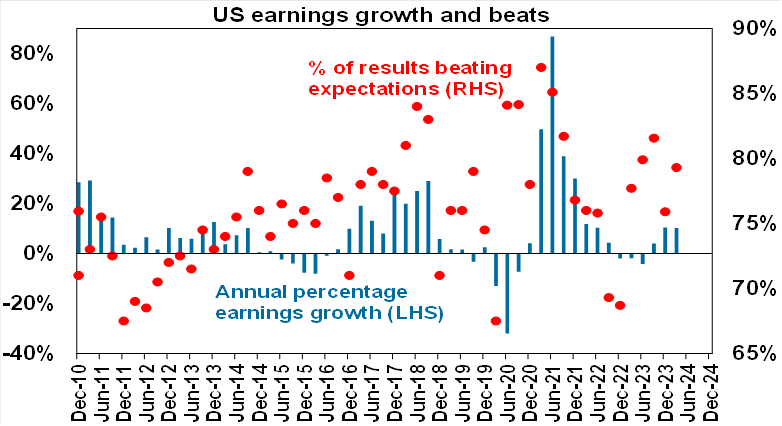 Shares have had a nice rebound from their falls in April, but the ride is likely to remain more volatile and constrained than we saw in the first three months of the year, as valuations remain stretched, sentiment didn’t fall to bearish extremes, uncertainty remains regarding the outlook for interest rate cuts and geopolitical risks around the Israel/Iran conflict and US election are high. However, we continue to see further gains in shares this year though as disinflation resumes, central banks ultimately cut interest rates and recession is avoided or proves mild.