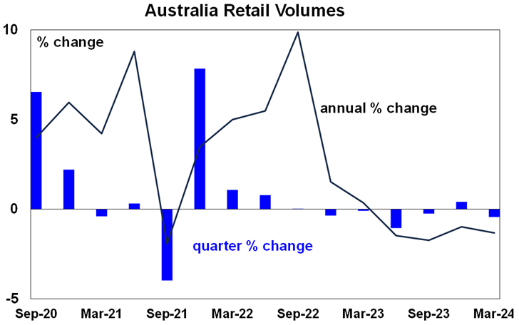 The weakness in Australian consumer spending was highlighted yet again with real consumer spending down 0.4%qoq in the March quarter. This was worse than expected with real retail sales now down five of the last six quarters consistent with flat to down March quarter consumer spending. What’s more real per person spending was down 1%qoq or 3.6%yoy and has fallen for seven consecutive quarters. Real retail sales in key discretionary areas like household goods, clothing and department stores are all down on a year ago. Cost of living pressures are clearly continuing to hit along with high interest rates in working to cool demand.