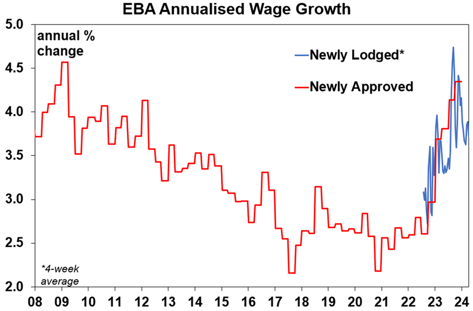 Newly lodged enterprise bargaining wage agreements continue to suggest the pace of wage rises under EBAs have peaked.