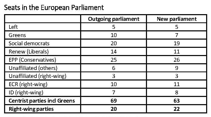 The EU elections – less dramatic than portrayedThe current concerns started with the EU parliamentary election that saw a rise in support for far-right parties that support less immigration, less rationalist economic policies and tend to be more nationalist. However, their success was less than feared. Right-wing parties certainly saw a rise in support but their proportion of seats in the new parliament only rose from 19.6% to 22%. See the next table. The rise in support for populist parties in this case on the right does point to a bias towards more protectionist policies, a crackdown on immigration and slower progress towards climate action. But this shouldn’t be exaggerated. Firstly, the centrist parties remain dominant with 63% of EU parliament seats which suggests little substantive change in EU policies or support for the Euro.