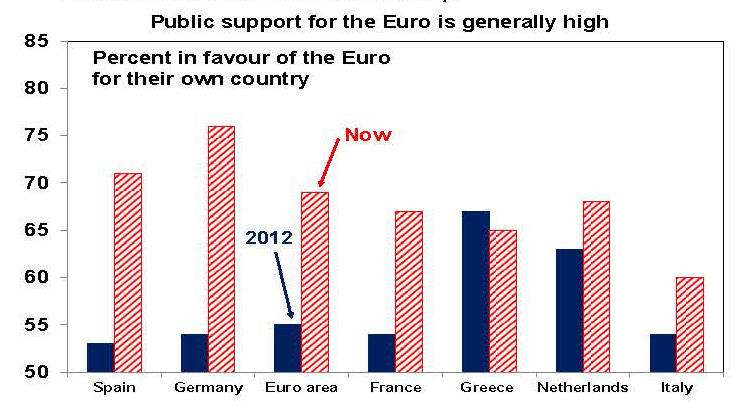 Of course, the fears of a breakup of the Eurozone was a recurring soap opera through the last decade with recurring crises in Greece, Spain and Italy and worries around French elections which saw the far right Marine Le Pen in run-off elections against the centrist Macron all leading to fears that any one of them could leave the Euro (with a Grexit, Itexit, Frexit, etc) triggering a contagion of countries seeking to leave. Investment markets threatened to make this self-fulfilling by pushing up relative bond yields in countries perceived to be vulnerable on the grounds that if they leave, the Euro bond holders will be paid back in a devalued Drachma, Lira, Francs etc. The crisis peaked in 2012 after various measures to strengthen European integration and the ECB’s commitment to “do whatever it takes to preserve the Euro” which was backed by various policy tools that could be triggered at times of instability in bond markets. But ever since then there has been various flareups, such as around Greek, Italian, Spanish and French elections. The British decision to leave the EU also briefly added to such fears although less so as Britain was not in the Euro.