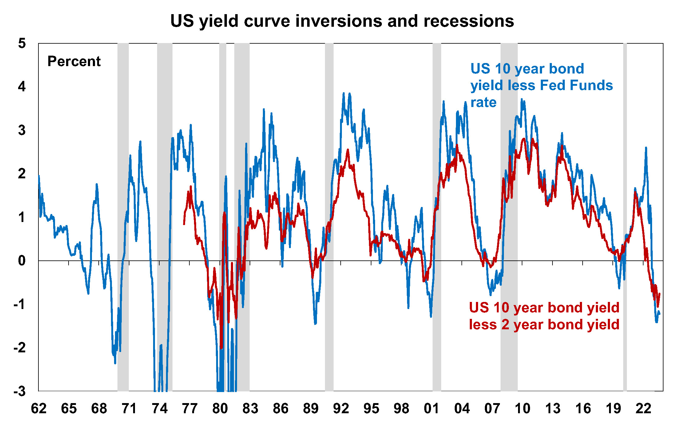 More US recession indicators flashing redThe basic argument for recession over the last two years is that the most rapid monetary tightening in major countries in decades and cost-of-living pressures would depress spending driving a recession. Indeed, the Eurozone, UK and Japan have seen growth stall or arguably have had mild recessions over the last 18 months and Australia is already in a “per capita recession” (with falling GDP per person) even though GDP has still been rising. But the US economy has been robust, and this has kept the key direction setting US share market strong until recently. However, while the US economy has been stronger than expected, the risk of recession never fully went away, with key indicators highlighting ongoing recession risk. In particular: