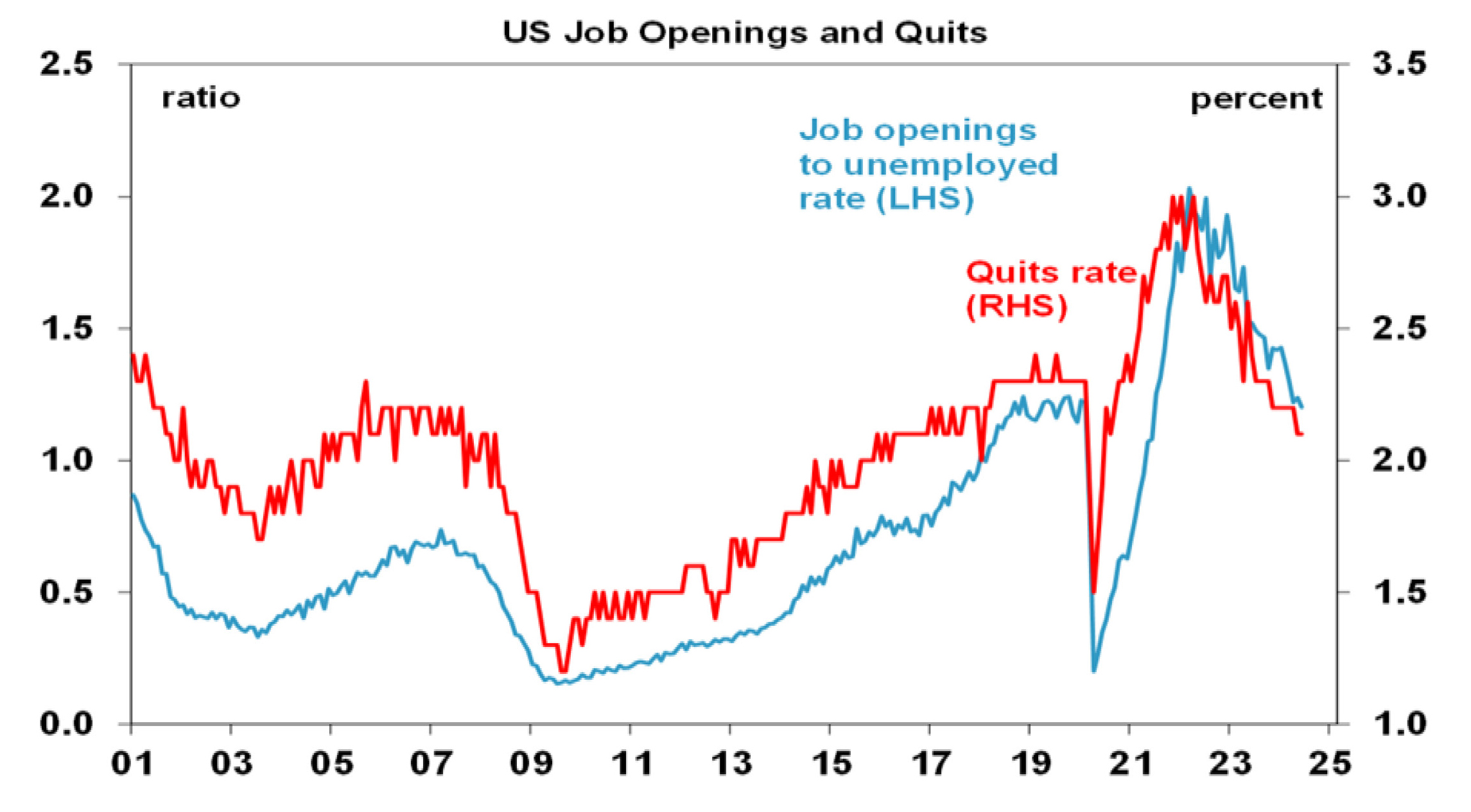 These supports are now fading. Weakening US jobs data suggest that it may indeed have been long lags at work. US job openings and people quitting for new jobs have been falling for some time now. Initially this may have been benign as slowing labour demand just pushed down job openings (and wages growth) but with unemployment remaining low.
