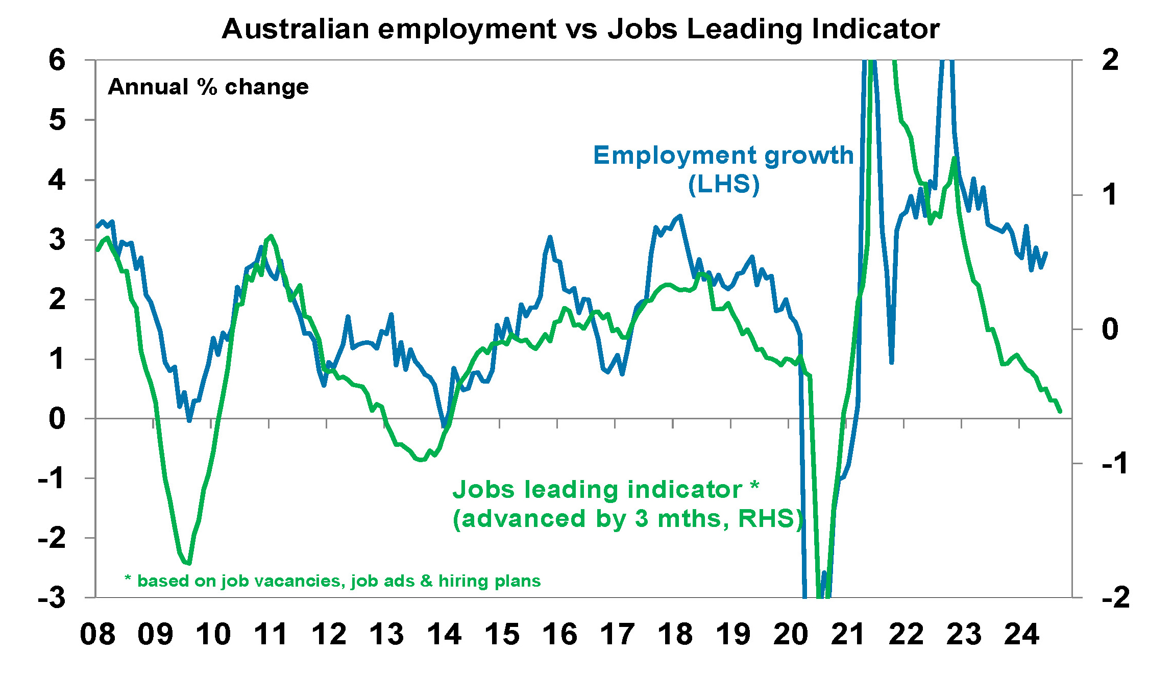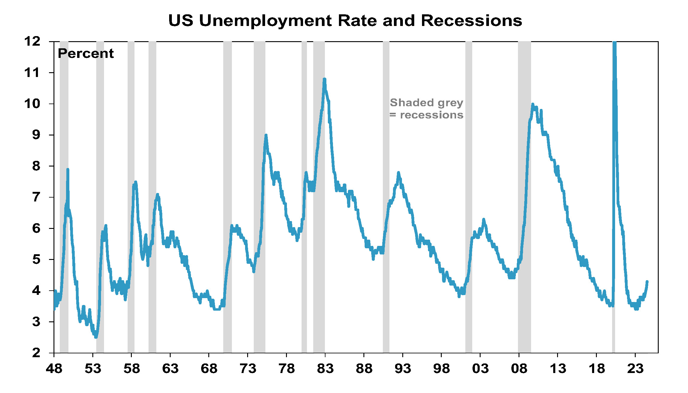 However, now falling labour demand is showing up in higher unemployment. Historically, small increases in US unemployment tend to be benign but once it goes beyond 0.5 percentage points it tends to keep rising and become associated with a recession as higher unemployment leads to lower spending in the economy. Based on this a US economist named Claudia Sahm observed that whenever the 3-month moving average of the unemployment rate rises by 0.5% above its prior 12 month low a recession has been underway. This has become known as the Sahm Rule and it was triggered by July jobs data in the US on Friday with unemployment spiking to 4.3%, up from a low of 3.4%. It can be seen at work in the next chart. It has a perfect track record, but relationships that work in the past don’t always work in the future and it may have been distorted by a lumpy 420,000 rise in the labour supply in July. That said it’s hard to ignore and suggests along with the still inverted US yield curve and the slump in the US leading indicator that recession risk is now very high in the US. Which is why share markets have plunged and the US money market is now back to allowing nearly 5 rate cuts this year. Recall it was expecting nearly 7 cuts early this year, so it’s almost gone full circle!