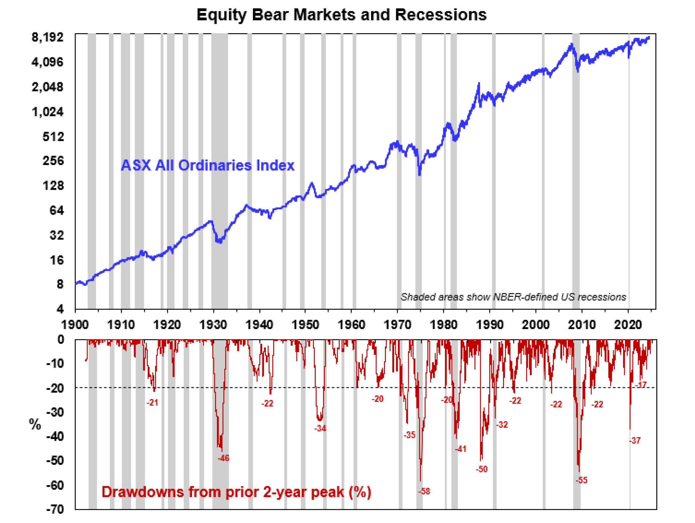 What would be the impact on shares?Recessions in Australia and the US have tended to be associated with bear markets in shares, ie, 20% or more falls, as they drive a slump in profits. The next chart shows the Australian share market and falls in it against US recessions. Shares are vulnerable now as valuations are stretched, investor sentiment has been high, geopolitical risk is high with the US election and escalating problems in the Middle East and August and September are often rough months. So, it’s likely too early to buy the dip!