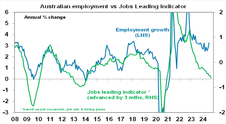 The jobs data likely helps keep the RBA in a holding pattern for now as the labour market is still tight, but it is gradually cooling, and the RBA – just like the Fed – does not want to knock it over the edge. With the rise in unemployment due to a rising labour supply, it’s not as bad as a rise in unemployment on the back of job losses. So, it won’t rush the RBA into rate cuts. But it’s still a cooling in the labour market and forward-looking labour market indicators – like job ads and hiring plans - continue to point to slower jobs growth ahead. This is reflected in our Jobs Leading Indicator. Lately it’s been working better for hours worked than employment, suggesting a degree of labour hoarding by employers. But it’s doubtful this will be sustainable if consumer demand growth remains weak as employers will then likely lay off more workers.