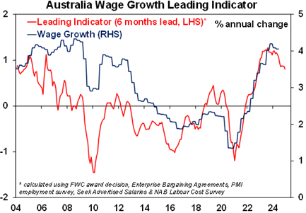 Wage growth past the peak. June quarter data showed wages growth of 0.8%qoq and 4.05%yoy. The annual growth rate was a bit higher than expected due to revisions to past quarters, but the quarterly increase was slower than consensus and RBA expectations and adds to evidence that wages growth is past the peak. While public wages growth is yet to start slowing, there are increasing signs of a slowing in the private sector where quarterly wages growth slowed to 0.7%qoq its lowest since December quarter 2021 and the proportion of private workers getting a wage rise in the quarter (11%) and their average wage rise (4.2%) has slowed from a year ago. What’s more the September quarter spike in wages this year will be well down on previous years due to the lower rise in award wages this year, increases under enterprise bargaining agreements look to have peaked and the slowing jobs market evident in a rising trend in unemployment and falling job vacancies point to less bargaining power all of which points to a further slowing in wages growth by year end. This is consistent with the signal from our Wages Growth Leading Indicator which is slowing. Annual wages growth at just over 4% remains too high relative to productivity growth to be consistent with the 2-3% inflation target and so will leave the RBA on edge, but the evidence is growing that its cooling so overall we see the wages data as consistent with the RBA leaving rates on hold for now as opposed to hiking.