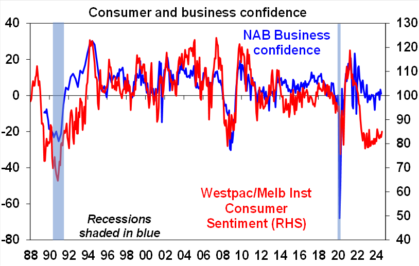 Shares remain at high risk of further falls and volatility over the next few months. Shares have seen a strong rebound from their lows earlier this month, recovering about two thirds of their losses. They have been helped by ongoing indications of central bank rate cuts, okay US economic data and mostly good earnings results. Further gains are possible, particularly as US data is unlikely to indicate recession is upon us just yet. However, shares remain vulnerable to further volatility over the next few months as: valuations remain stretched; investment sentiment is still relatively upbeat (with VIX or the “fear index” back to late July levels) which is negative from a contrarian perspective; recession risk is high in the US and Australia with forward looking jobs indicators pointing down; and geopolitical risk is high particularly around the US election and the Middle East; and we have only just started in the seasonally weak period of August and September which can sometimes extend into October/November in US election years.