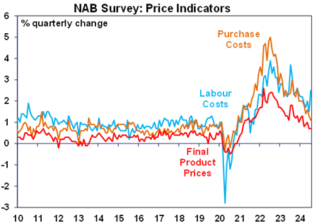 While the July NAB business survey showed a lift in business conditions, the trend remains down, and business confidence fell. The NAB survey showed that labour cost growth rose in July reflecting the annual award wage rise (although far less than last year) but growth in purchase costs & final product prices continue to trend down which is good news for inflation.