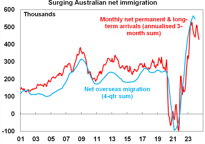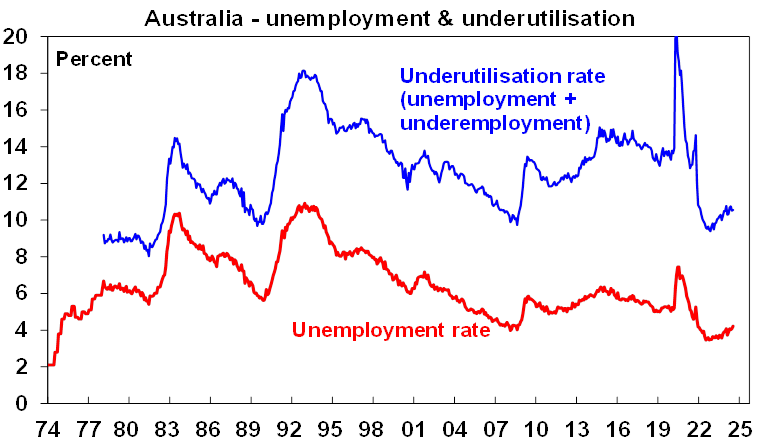 Australian economic events and implicationsJuly jobs data was mixed. Employment growth was solid and hours worked rose but unemployment rose again to 4.2% as labour market participation rose to a record high (likely due to immigrants having a higher share of working age people than the existing population along with cost of living pressures forcing more to seek work) and population growth remains very strong. Overall, the labour market is continuing to gradually cool with the rising trend in unemployment indicating that the demand for labour is not quite keeping up with strong growth in the supply of workers and labour underutilisation at 10.6% is well up from its November 2022 low.