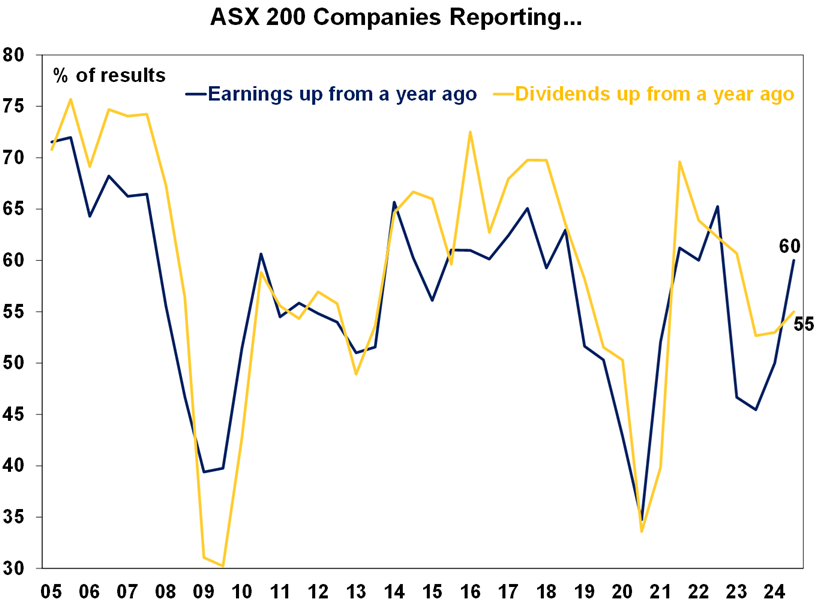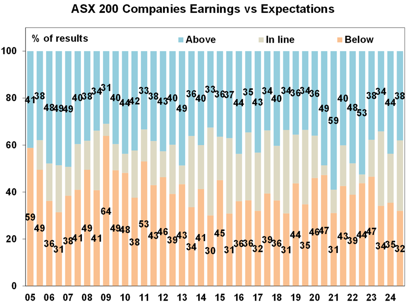 It's early days in the Australian June half earnings reporting season with only about a third of major companies having reported. So far results have been okay with slightly less than normal upside surprise, but also less than normal downside surprise and an increase in the number of companies reporting profits or dividends up on a year ago compared to the December half reporting season. Consensus expectations are for a 3.6% fall in profits in 2023-24 with a big fall in energy sector profits on the back of lower oil, coal and gas prices and small falls in profits in the mining, consumer staples, IT and financial sectors but other sectors seeing profit gains. The signal on consumer spending has been soft with sales generally down and weak media advertising, but some like JB HiFi coming in better than expected. CBA reported a less than expected fall in profits and continuing low but rising mortgage arrears and NAB also reported increasing arrears. Overall, investors appear to be looking through the mixed picture with hopes for relief ahead from lower interest rates. Just bear in mind though that there is a tendency for companies with good results to report early so results may soften over the next couple of weeks.