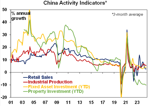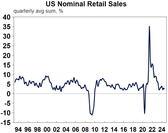 Major global economic events and implicationsUS economic data released over the last week was mixed but still consistent with okay growth. On the positive side retail sales rose more than expected in July, jobless claims fell again partly reflecting the unwinding of impacts from Hurricane Beryl and small business confidence rose in August. Against this though industrial production fell more than expected in July (again partly due to Hurricane Beryl), the August Philadelphia Fed manufacturing conditions index fell sharply and while the New York Fed index improved slightly both remain soft and the August home builders’ conditions survey deteriorated further. The overall picture is that the economy is continuing to grow supporting expectations for a soft landing. But recession risk still remains high given the ongoing inverted yield curve, large slump in the US leading index and the ongoing deterioration in forward looking jobs data along with the rising trend in unemployment.