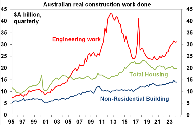 June quarter construction was weak again. Total construction rose just 0.1%qoq which was less than expected and followed a 2% fall in the March quarter with falls in residential and non-residential building offset by a rise in public infrastructure spending. As can be seen in the chart below housing investment has been tracking sideways over the last few years despite the surge in population.