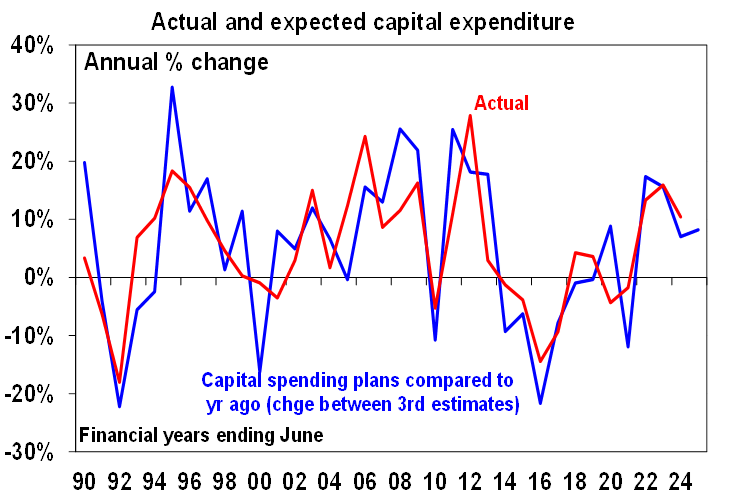 The good news remains that global rate cuts are continuing as central banks like the Fed and ECB are shifting their focus from inflation to preventing a significant deterioration in jobs. Two aspects of Fed Chair Powell’s Jackson Hole comments are of particular relevance to Australia. First, he noted that “we do not seek or welcome a further cooling in labour market conditions”. This is relevant for Australia because the rise and level of US unemployment at 4.3% is not that different to the rise and level of unemployment here at 4.2%. Second, he noted that “an important takeaway from recent experience is that anchored inflation expectations, reinforced by vigorous central bank actions, can facilitate disinflation without the need for slack.” If the US experience is any guide the RBA’s concerns about continuing excess demand may be overstated. Time will tell.