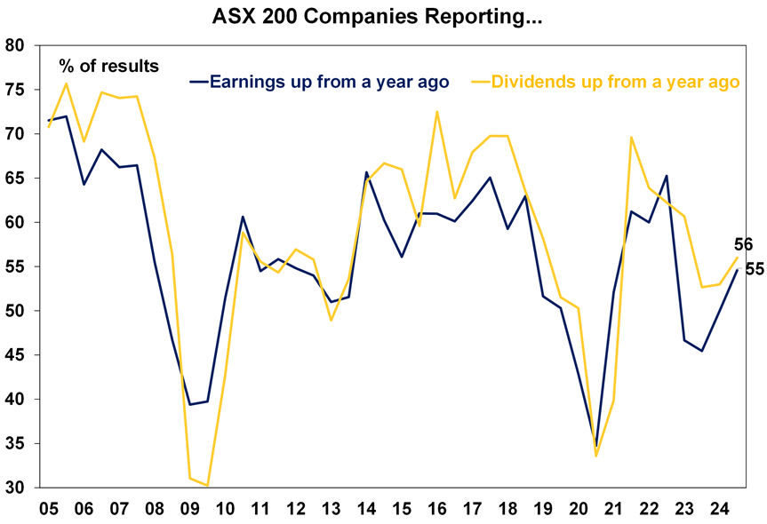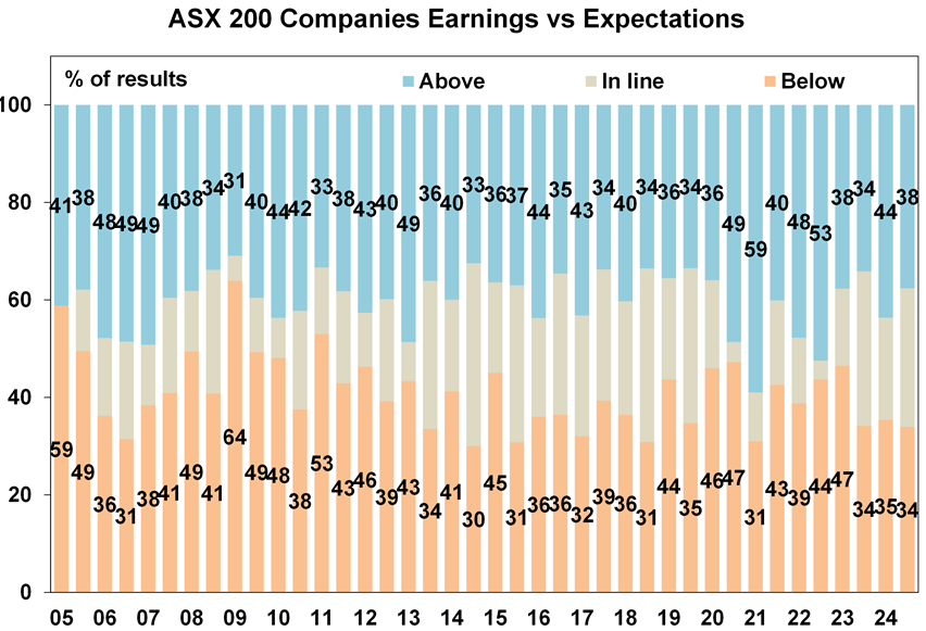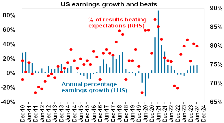 The Australian June half earnings reporting season is now complete. Results have been okay with slightly less than normal upside surprise, but also less than normal downside surprise and an increase in the number of companies reporting profits or dividends up on a year ago compared to the December half reporting season but with both slightly weaker than normal. However, in aggregate results were softer than expected with earnings down 4.4% in the last financial year which was worse than consensus expectations for a 3.5% fall at the start of August. Energy shares saw the biggest fall in earnings, but this was as expected with the downside surprise mainly concentrated in industrials, telcos and utilities. The signal from consumer stocks was mixed but not as bad as feared. The rise in the proportion of companies raising dividends is positive but outlook comments were more cautious and this along with the weaker than expected overall results for 2023-24 led to a downgrade in consensus earnings expectations for this financial year to a 4.6% rise from a 5.4% rise at the start of August. Despite the downgrade to aggregate earnings expectations, investors appear to be looking through it with hopes for relief ahead from eventually lower interest rates.