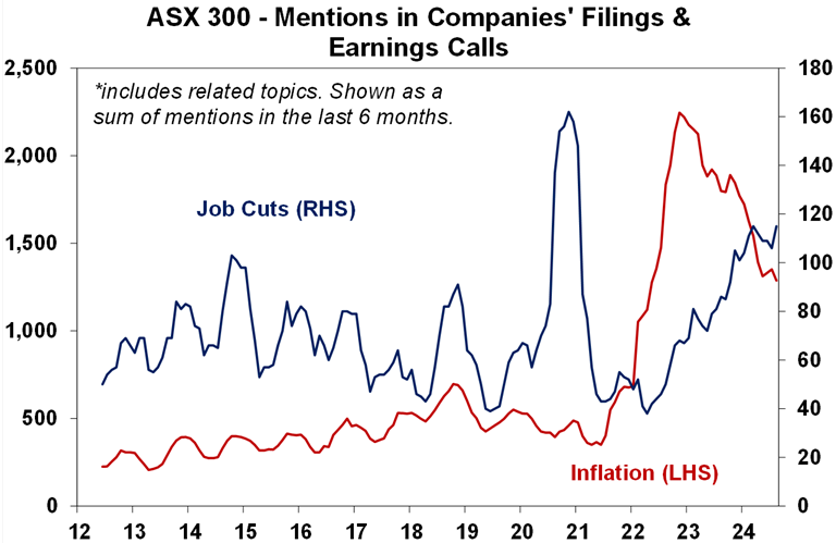 The good news is that less companies are talking about inflation, but unfortunately there has been a rise in talk of job cuts, albeit from a low base – note the different scales in the chart below.
