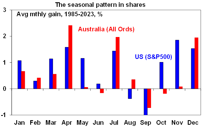 August saw shares put in a strong recovery from the slump at the start of the month. For the month US shares are up around 1.3% and global shares are up 0.9%. Australian shares fell around 0.2%, which is still not bad considering their 5.7% fall early in the month. However, shares remain at high risk of further falls and volatility over the next few months as: valuations remain stretched; investment sentiment is still relatively upbeat which is negative from a contrarian perspective; the AI boom in tech stocks is looking shaky with Nvidia down despite beating expectations; recession risk remains high in the US and Australia; and geopolitical risk is high particularly around the US election and the Middle East; and September tends to be the weakest month of the year for shares.