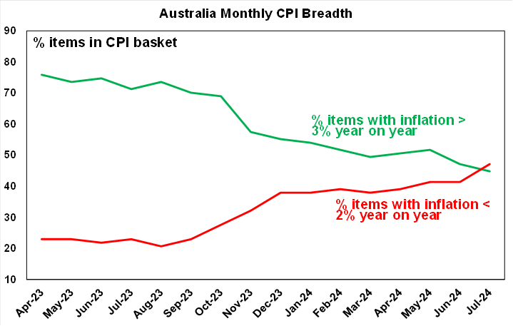 The July CPI is unlikely to change the RBA’s thinking. The monthly CPI should be treated cautiously, but for what it’s worth it suggests that inflation is roughly on track for RBA forecasts for the September quarter for a fall to 2.9%yoy and trimmed mean to slow to 3.6%yoy. So, it’s not going to drive another rate hike. But nor is it going to bring forward a rate cut. Our base case remains for the first rate cut starting in February as the RBA is unlikely to be confident enough, about inflation falling to target, until then to start cutting.