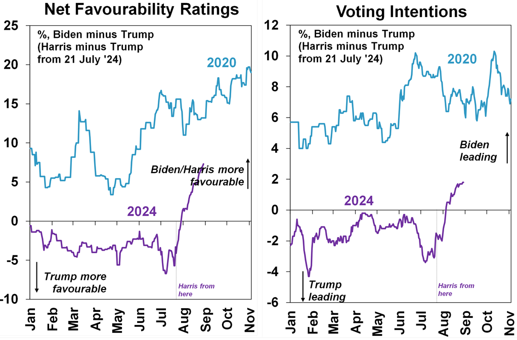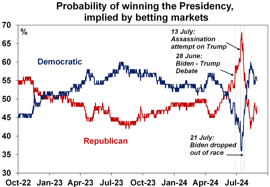 The Democrat bounce after Harris replaced Biden has largely been sustained helped by the Democrat National Congress, but the honeymoon could wear off. Harris continues to lead in the average polls and favourability, is slightly ahead in the top battleground states and a Harris/Democrat victory is seen as around 55% probable by betting markets. However, Trump still leads in 3 of the 7 battleground states and Harris is still well behind where Biden was in 2020. So it still looks like being a close election and as such there is a high risk that at some point in the next month or so financial markets will start to become more concerned again about Trump policies which point to higher inflation and a trade war.
