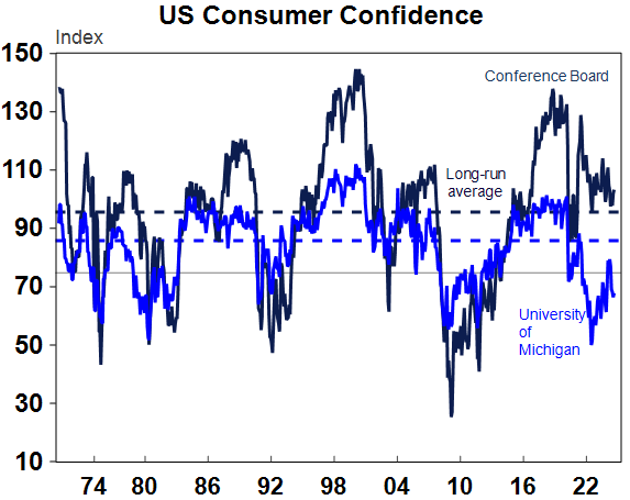 Major global economic events and implicationsUS economic data released over the last week was mixed. June quarter GDP was revised up slightly to 3% annualised with stronger consumer spending, initial jobless claims fell slightly, and consumer confidence rose in August but across the Conference Board and University of Michigan measures remains subdued.