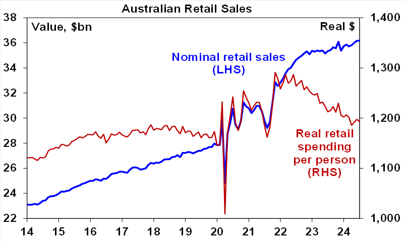 Australian economic events and implicationsAustralian economic data releases over the last week were mostly soft. After two months of support from end of financial year sales retail sales were flat in July, defying expectations for a 0.3% gain and suggesting the tax cuts have not provided a boost as cash strapped Australians use them to boost their savings. We are still growing our spending on food (as there are more of us), but spending in discretionary areas like clothing, department stores, cafes and restaurants and household goods is flatlining and down in real terms. Real retail spending per person is in a clear down trend.