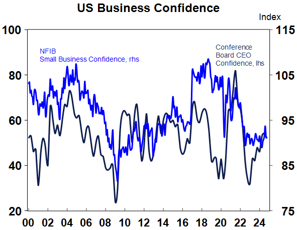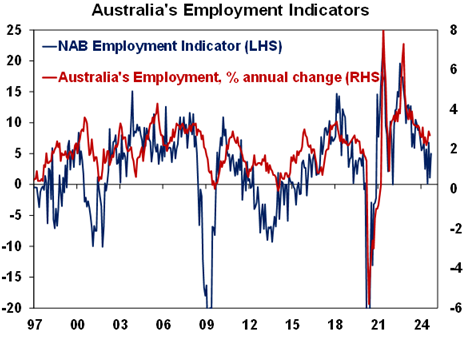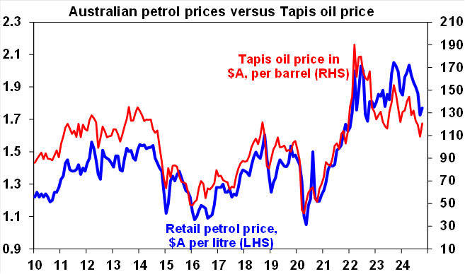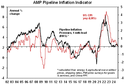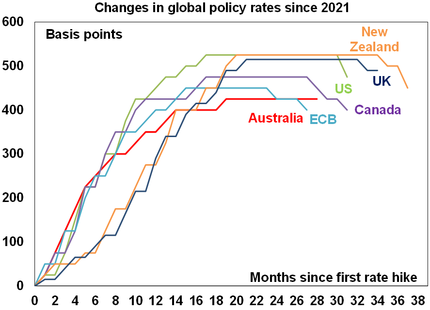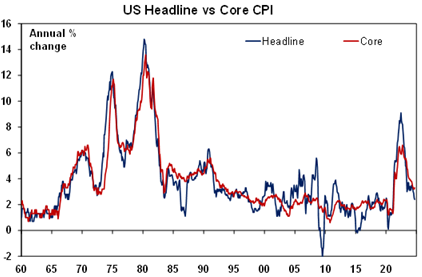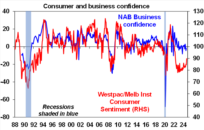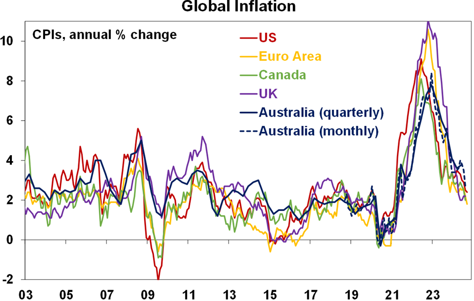 Falling inflation and rates globally are positive for Australia as we lagged on the way up and are just likely doing the same on the way down. The minutes from the last RBA meeting retained the RBA’s cautious relatively hawkish stance. Yes, it omitted the line that “it was unlikely that the cash rate…would be reduced in the near term” but Governor Bullock repeated the same line at the post meeting press conference. However, we remain of the view that the fall in inflation and interest globally is good news for Australia because just as Australia lagged on the way up in inflation and rates its doing the same on the way down and so is no cause for alarm. Its also worth noting that Australian monthly trimmed mean inflation at 3.4%yoy is only just above US core inflation at 3.3%yoy and running about three months behind. And the latest NAB business survey and Melbourne Institute Gauge point to an ongoing fall in underlying inflation in Australia. So our base case remains for the RBA to start cutting in February with a risk that it could come in December after September quarter and October monthly inflation data.