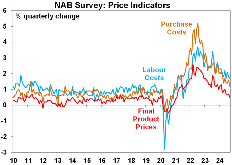 The good news is that the NAB survey showed a further easing in cost and price pressures. Labour costs remain elevated but final product price increases are back to the top end of their pre-Covid range.
