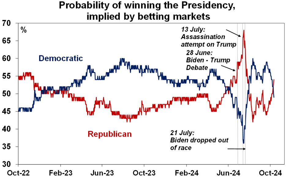 Trump pushing ahead in US election polling. Harris is still ahead in national polling but only by 1.8 points whereas Biden was ahead by more than 9 points at this point in 2020, Trump is now leading in 5 of the 7 battleground states and betting markets now favour Trump over Harris. And the hurricanes and war in the Middle East appear to be giving him a boost as he claims he would handle the storms better and the wars wouldn’t have happened if he were president. So far the US share market does not seem to fussed – although shares that might benefit under Trump are starting to outperform shares that might benefit under Harris – but we could start to see more volatility if this continues given Trump’s policies to ramp up tariffs and kick off another trade war.