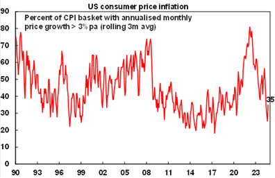 The breadth of high US inflation remains benign with the proportion of CPI basket components seeing monthly annualised inflation over 3% running at 35% in September which is in the range seen in the decade before the pandemic.