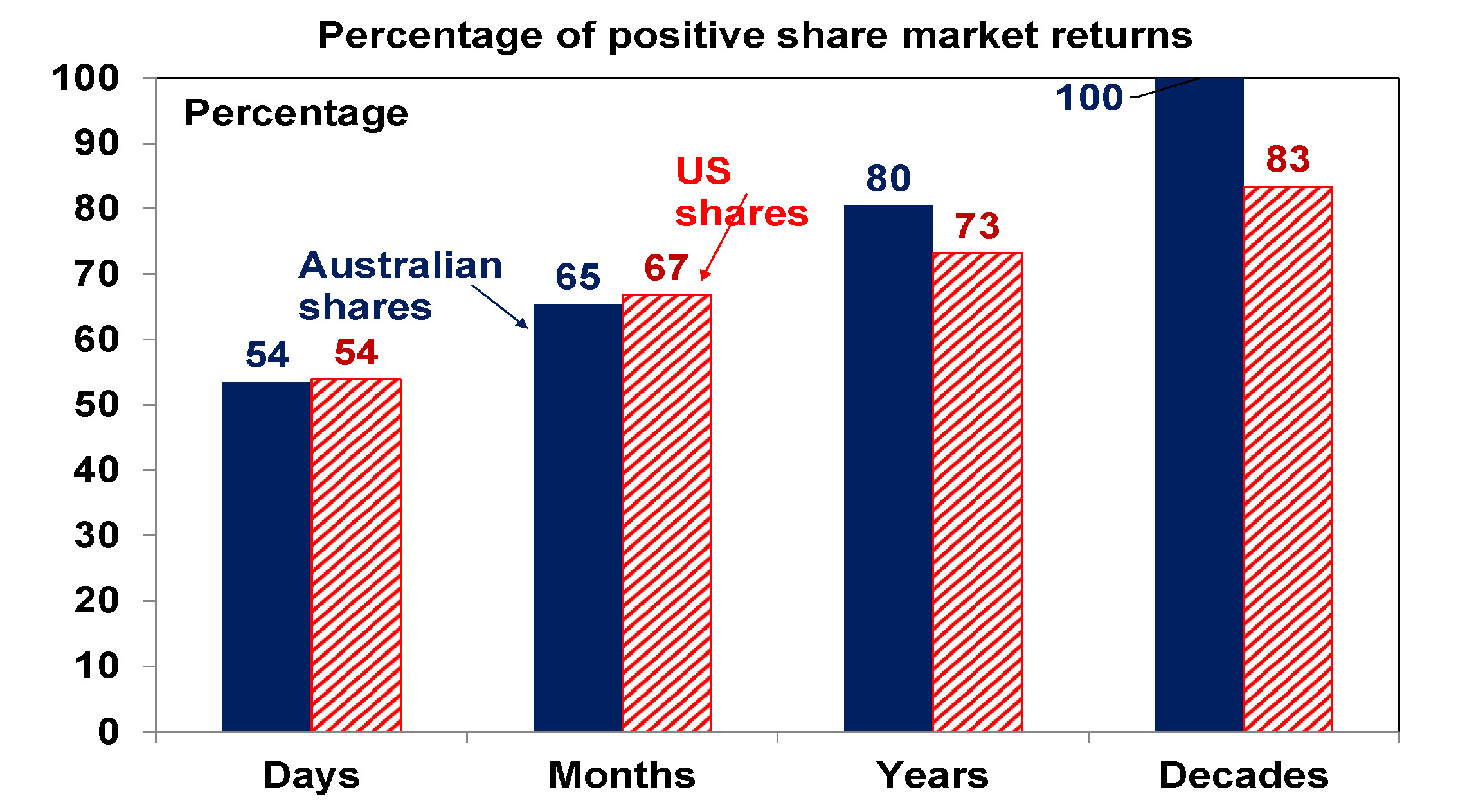 Checking up on how your investments are doing is a good thing, surely? But the danger is that the more investors are exposed to news around their investments, the more they may see them falling. Whereas share markets have historically generated positive returns more than 60% of the time on a monthly basis and more than 70% of the time on a calendar year basis, day- to-day it’s close to 50/50 as to whether the share market will be up or down.