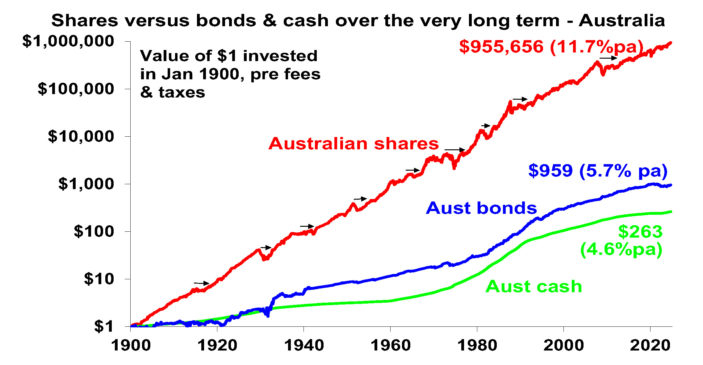 The chart below shows the value of $1 invested in various Australian assets since 1900 allowing for the reinvestment of interest and dividends along the way. That $1 would have grown to $955,656 if invested in shares but only to $263 if invested in cash. Despite periodic setbacks, shown with arrows (such as WWI, the Great Depression, WWII, stagflation in the 1970s, the 1987 share crash & the GFC), shares and other growth assets grow to much higher values over time thanks to their higher returns over the long term than cash and bonds and thanks to the magic of compound interest where higher returns build on higher returns through time.