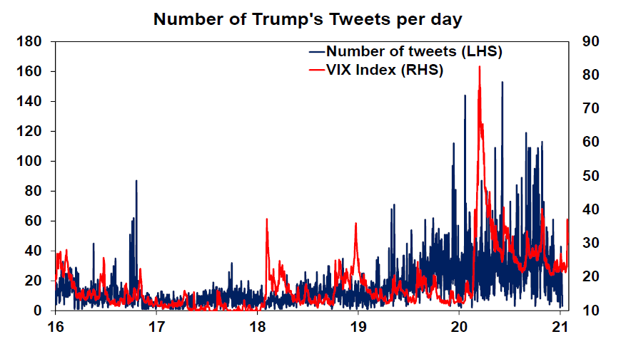 - And we are likely to see a return to Trump’s erratic style of policy making with a renewed focus on his social media posts, with all the noise that comes with that. Through 2020 Trump was averaging 33 tweets a day. That said there was no clear correlation between his tweet volume and the VIX expected stock market volatility index, apart from the common driver for both of the Covid pandemic in 2020.