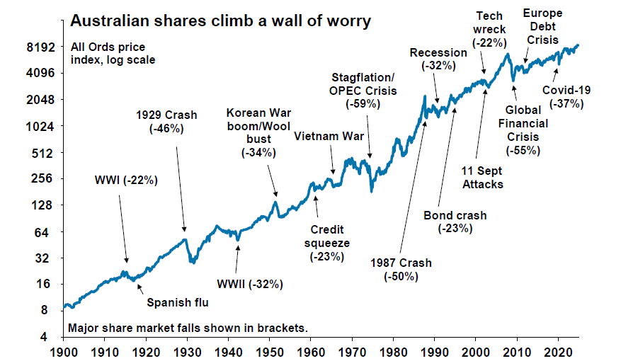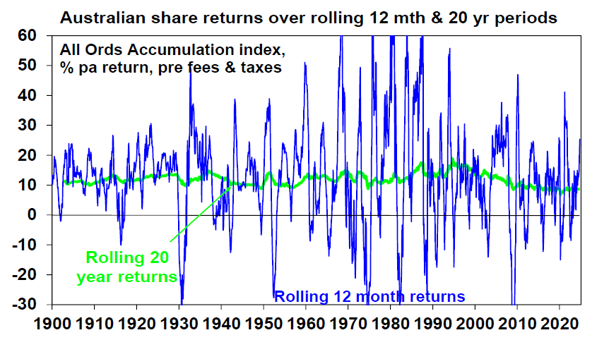 Firstly, put the latest worry in context. There’s always been an endless stream of worries. Here’s a partial list since 1900: 1906 San Francisco earthquake; 1907 US financial panic; WWI; 1918 Spanish flu pandemic (up to 50 million killed); The Great Depression; WW2; Korean War; 1957 flu pandemic; 1960 credit crunch; Cuban missile crisis; Vietnam War; 1968 flu pandemic; 1973 OPEC oil embargo; Watergate; the cancellation of The Brady Bunch; stagflation in the 1970s; the 1979 oil crisis; Latin American debt crisis; Chernobyl disaster; 1987 crash; First Gulf War; Japanese bubble economy collapse; US Savings and Loan crisis; Asian crisis; Tech wreck; 9/11 terrorist attacks; Second Gulf War; the GFC; the Eurozone debt crisis; US trade wars; Trump 1.0; the coronavirus pandemic; inflation; and war in Ukraine and around Israel. But despite this, investment returns have actually been good as shares climb a long-term wall of worry. Since 1900 Australian shares have returned 11.7% pa and US shares 10% pa (including capital growth and dividends). And in relation to Trump we survived his first time around and he still wants shares to go up, not down!