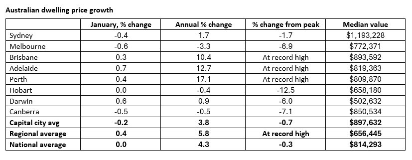 CoreLogic data shows that average home prices were flat in January, with a rise in regional prices offsetting a continued fall in average capital city prices.