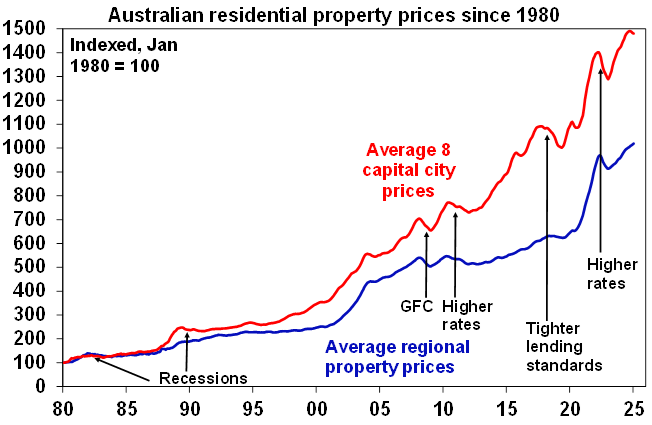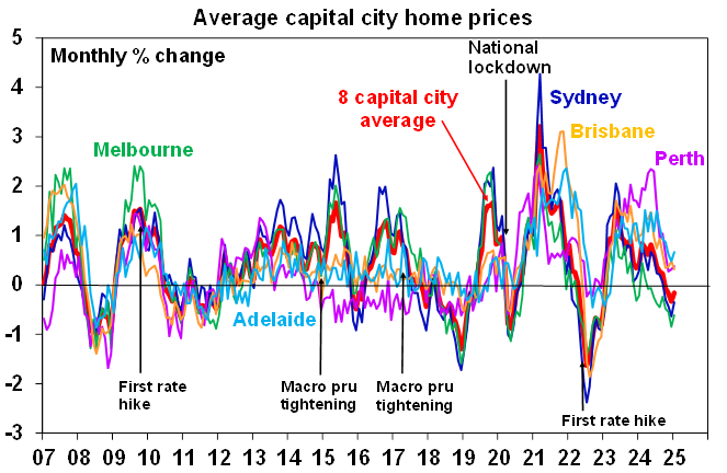 After a shallow downswing in average prices, RBA rate cuts are expected to drive an upswing this year. However, just as the downswing has been modest thanks to the ongoing undersupply of property, the upswing is likely to be modest too as while there is still a big housing shortfall in Australia, the upswing will be starting from a point of still poor affordability, interest rates are only likely to fall modestly, and population growth is slowing. After 4.9% growth last year, we expect average property prices to rise around 3% this year.