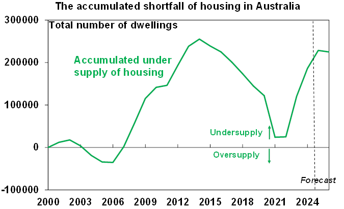 The accumulated housing shortfall is estimated to be around 200,000 dwellings at least, and possibly as high as 300,000 dwellings. It is likely to remain significant for a while yet as building approvals running around 180,000 dwellings a year indicate that housing completions are likely to run below government objectives for 240,000 homes a year (or 1.2 million over five years) for some time to come and may never reach that objective