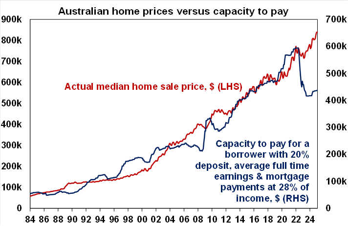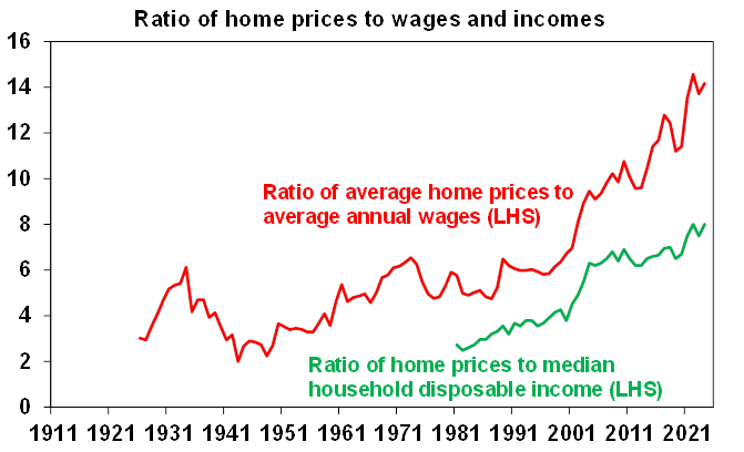 While interest rates are likely to start falling this month, in the absence of recession and much higher unemployment we only expect about 4 or 5 rate cuts in total, taking the cash rate back to a low of around 3.1 to 3.35% next year and mortgage rates to around 5%. This will only partially reverse the 13 rate hikes since May 2022 and leave mortgage rates well above their record lows of around 2 to 3%. As such, the buying capacity of home buyers is expected to improve but remain well below the levels seen in 2021-22. This will limit the upside in property prices. And with a huge gap likely to remain between average prices and the capacity of borrowers to pay for a new home leaves a downside risk hanging over the market if something goes wrong – like a sharp rise in unemployment.